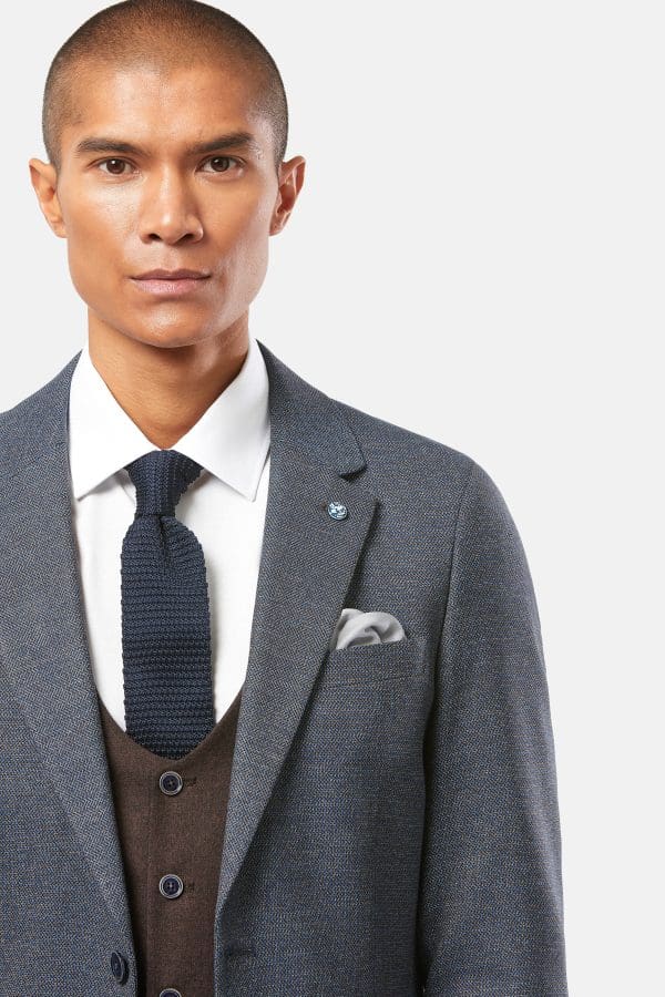 This crisp ensemble is tailored to a streamlined fit with signature detail adding further distinction to this elegant suit. Contemporary look, luxurious touch, the new ‘Tom’ suit exudes refined flair for the season ahead. This sleek new addition is a 3-piece suit featuring an indigo patterned cloth with a brown contrasted waistcoat.