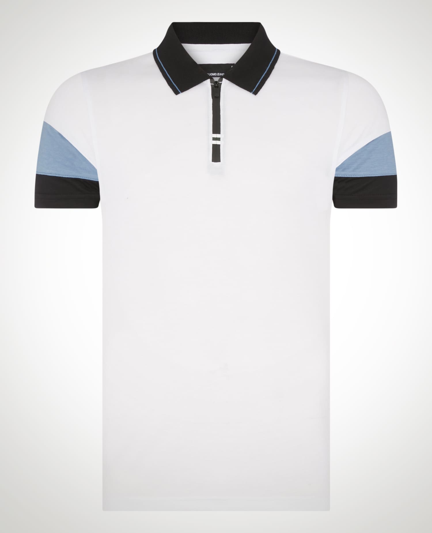 White tapered fit cotton-stretch jersey polo shirt with double contrast stripe on sleeves, collar edge tipping detail and half zip closing.