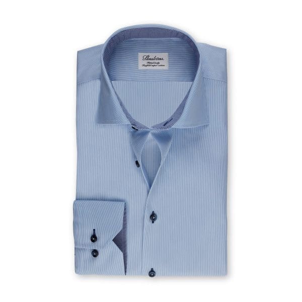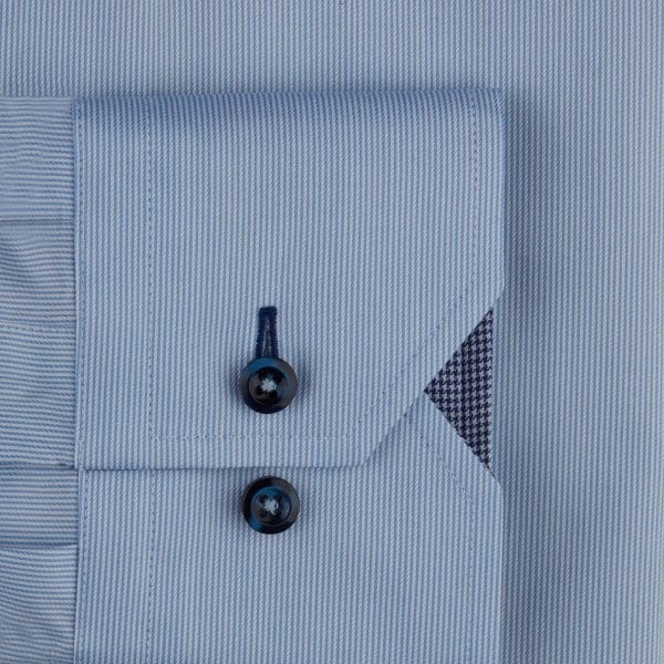 This light blue fine striped fitted body shirt is cut from twofold superior twill for a slightly tailored waist. It has a blue hounds-tooth contrasting details and navy seem around the button holes. Finished with single cuffs, navy luxurious mother of pearl buttons and a moderate cut away collar.